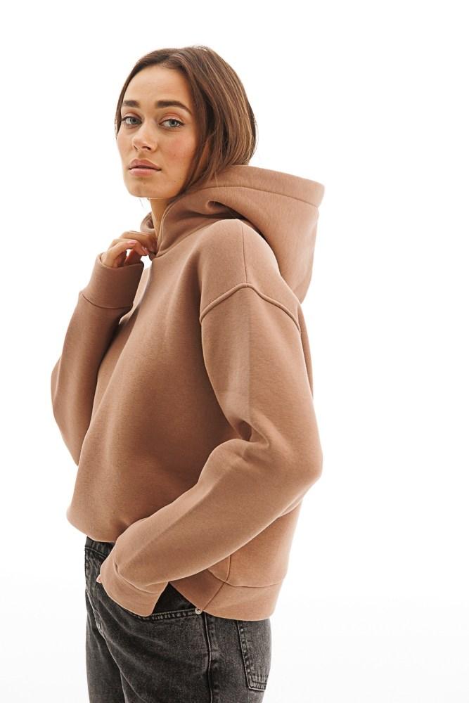 Це молодіжне жіноче худі ідеально підійде для власниць невисокого зросту, а також тих, хто любить штани з високою посадкою, завдяки укороченій довжині. Модель зшита з трикотажу з начосом, а капюшон усередині доповнений підкладкою з основної тканини. Прямий низ і довгі рукави обшиті манжетами під тон, пройми у виробі опущені та доповнені декоративною строчкою в місці вшивання рукава.