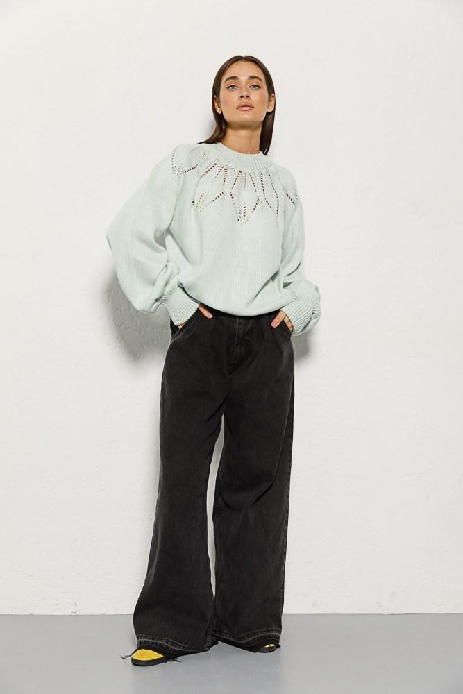 Модель повністю виготовлена з панчішного в'язання, а вгорі прикрашена ажурними візерунками у формі листочків. Кругла горловина доповнена коротким коміром із тонкою гумкою на краях. Прямий низ виробу закінчується в'язанням у формі манжети з тонкою гумкою на краях, а висока манжета, пришита внизу довгих рукавів-реганів, підкреслює об'єм у нижній частині рукава.