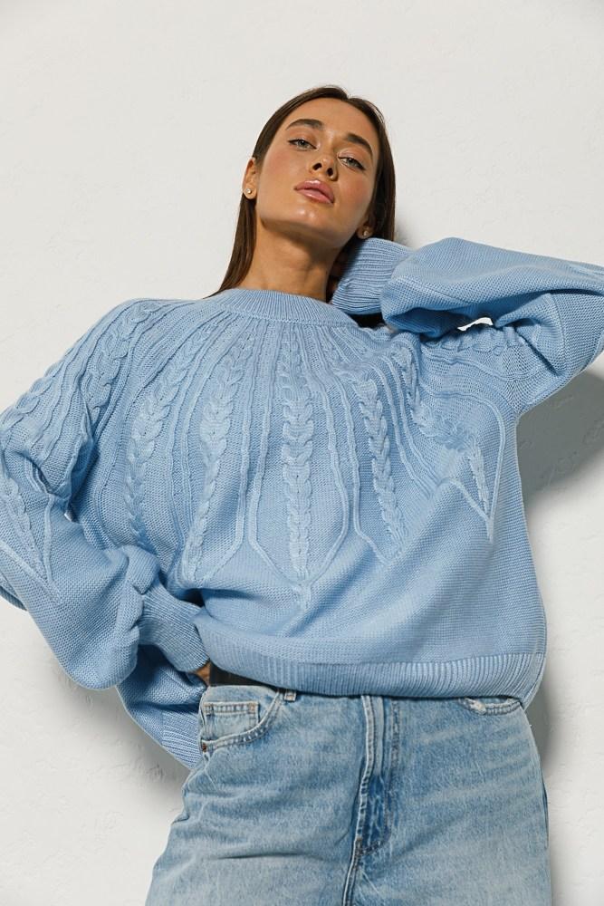 Модель повністю виготовлена з хусткової в'язки, а вгорі виробу та рукавів декорована в'язаними візерунками з клинок і кісок, які разом створюють приголомшливий ефект. Довгі рукави-реглани до низу плавно розширюються й закінчуються пришитою в'язаною манжетою. Короткий комір на круглій горловині, а також краї прямого низу виготовлені з в'язання в техніці "гумка". Усі краї виробу додатково обшиті тонкою гумкою.