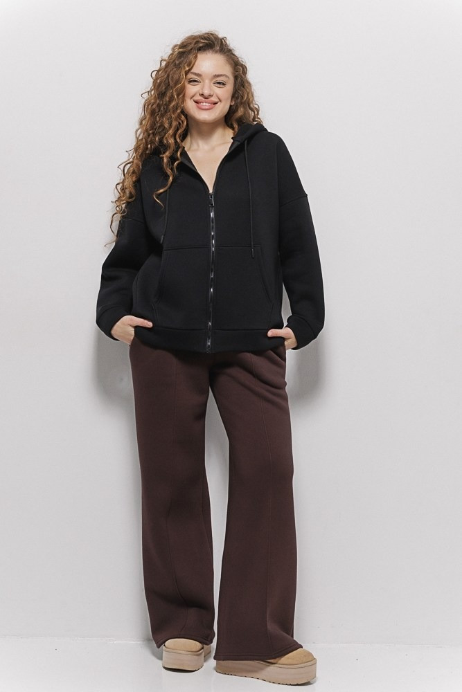 У цій моделі з трикотажу з начосом лінія плеча подовжена, а прямий низ і довгі рукави обшиті манжетами в тон. Капюшон виготовлений без підкладки, із зав'язками зі шнурка. Спереду внизу нашиті великі накладні кишені. Бічні шви з додатковою строчкою розташовані під кутом і плавно переходять на передню частину виробу.